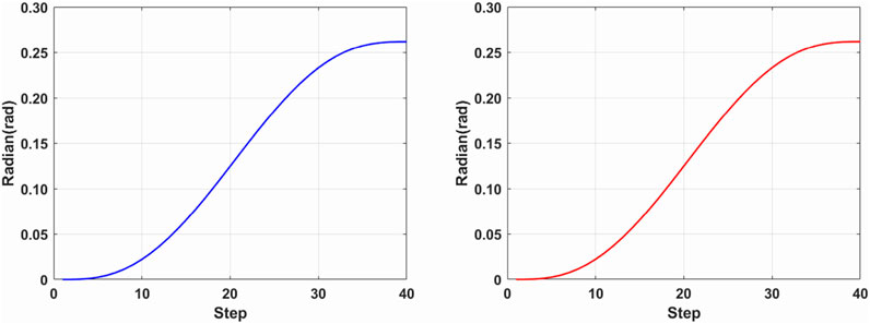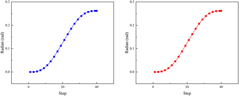 Figure 5 displays the variation curves of the movable joint angles for the chest and leg structures. It is evident from the figure that the motion curves of each joint angle along the spatial planning trajectory, determined by the initial and termination points, exhibit smoothness and align with the specified range of motion requirements.