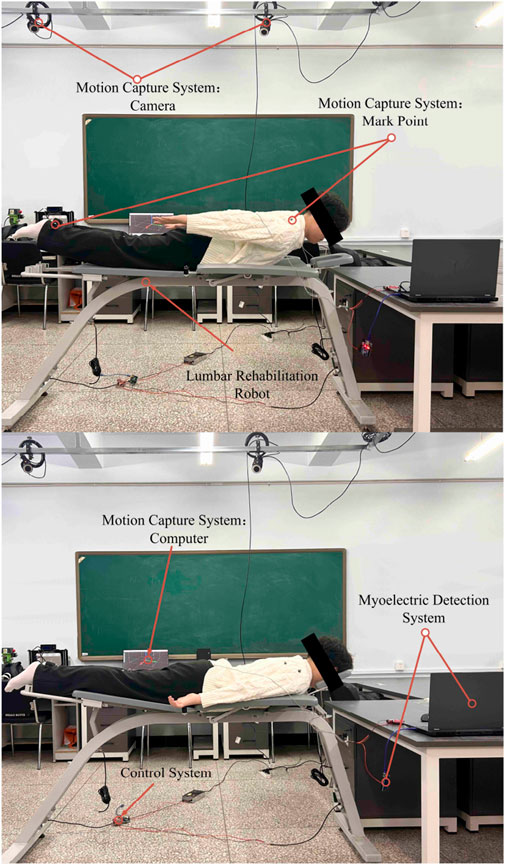 To examine the lumbar muscle training facilitated by the lumbar rehabilitation robot, we employed two motion capture methods. Firstly, the human body underwent autonomous lumbar rehabilitation training. Secondly, the two electric actuators of the robot applied a force of 200N to the human body individually. Motion data was captured using these methods to establish a basis for studying the activity patterns of the human lumbar muscles.