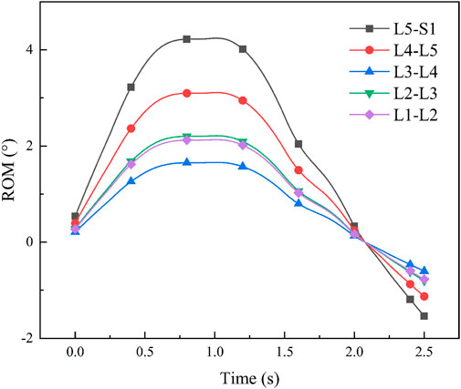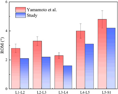 After determining the joint angles of the human-computer coupled lumbar spine, we conducted a comparison with previous theoretical studies. Yamamoto I et al. examined human lumbar spine posterior extension mobility Yamamoto et al. (1989), applying a 10 N-m force to induce lumbar spine bending. Their study yielded average angle values: L1-L2 at 2.8