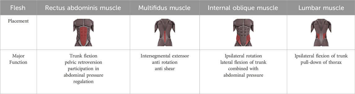 Analyzing the lumbar spine stabilization system is essential for designing stabilityfocused rehabilitation programs. This system includes passive, active, and neural subsystems Radziminska et al. (2017) Studnicka and Ampat (2023), with the active subsystem - comprising muscles and tendons - being the focal point of this discussion. The core muscle groups responsible for lumbar spine movement and stability, such as the Rectus abdominis, Multifidi, Internal Oblique Abs, and Quadratus Lumborum Araujo et al. (2022), play a crucial role. To investigate the mechanical structure’s supportive role in lumbar rehabilitation training, As shown in Table 2. This chapter will utilize a human-robot coupling model to gather joint and muscle data for comparison with the patient’s physiological state.