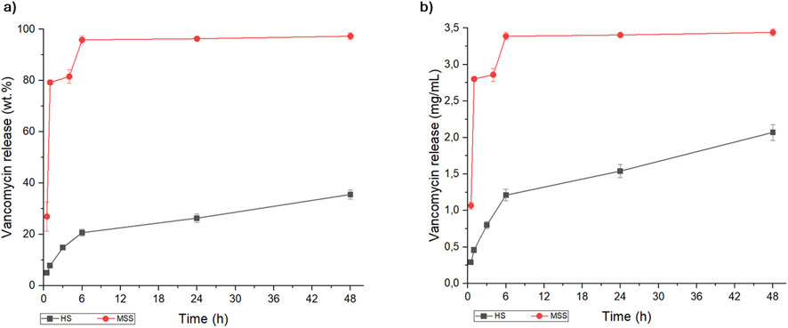 The present study investigates the efficacy of HS as an efficient drug delivery system for the sustained release of antibiotics. VNC, GNT or TBR were successfully loaded onto the HS surface through fast and simple procedure, enabling the immediate preparation of medicated implants in the operatory theatre prior to surgical intervention. The release profile of VNC from the HS was initially evaluated in comparison with that from a MSS, with the aim of assessing the influence of the microstructure and the physicochemical features of the scaffolds under physiological conditions. In particular, the VNC loading on both the scaffolds was performed by dropwise settling of 50 mg/mL of drug solution onto the scaffold. The release test of VNC from MSS and HS was performed for up to 48 h in PBS medium (pH 7.4) at 37 °C, under constant oscillation (Figure 2). This timelapse was chosen as an incubation time of 48 h is widely considered as sufficient and acceptable for evaluating the antibacterial activity of a drug in vitro (Egervärn et al., 2007).