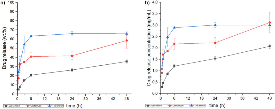 Figure 3. Kinetic release of vancomycin, (black line), gentamicin (red line) and tobramycin (blue line) from hybrid scaffold, expressed as (a) weight percentage (wt.%) and (b) concentration (mg/mL).