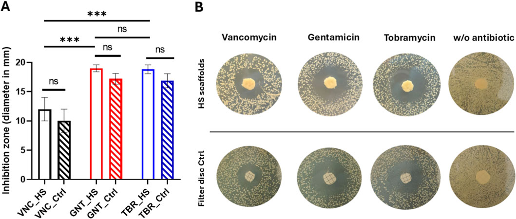Staphylococcus aureus bacteria at a concentration of 104 CFUs/mL, according to European Committee on Antimicrobial Susceptibility Testing (EUCAST) guidelines, were plated on MH-agar plates (Guagliano et al., 2025). To perform the agar diffusion test, HS scaffolds were cut, in sterile conditions, in round circles of 0.64 cm2 and functionalized with antibiotics: vancomycin 5.35 mg/scaffold, gentamicin 4.28 mg/scaffold and tobramycin 4.28 mg/scaffold. Cellulose nitrate filter discs of 0.64 cm2, used as control, were functionalized with the same quantity of antibiotics released from the HS scaffolds after 24 h according to the drug release curve. Moreover, the agar test was conducted on HS scaffolds and on filter discs containing PBS instead of antibiotics, which were used as negative controls. These controls were intended to demonstrate that the antibiotic-unloaded samples are not antibacterial. Furthermore, a range of drug concentrations ≥ MIC value (ranging from 2 to 200 μg/mL) were loaded onto filter discs to assess the variation of inhibition zones resulting from the different quantities of released antibiotics (data not shown). The plates were incubated for 24 h at 37 °C and the inhibition zone diameter (in mm) was measured. The experiment was performed in triplicate. Statistical analysis was conducted through a one-way analysis of variance (ANOVA), followed by Bonferroni’s test between samples.