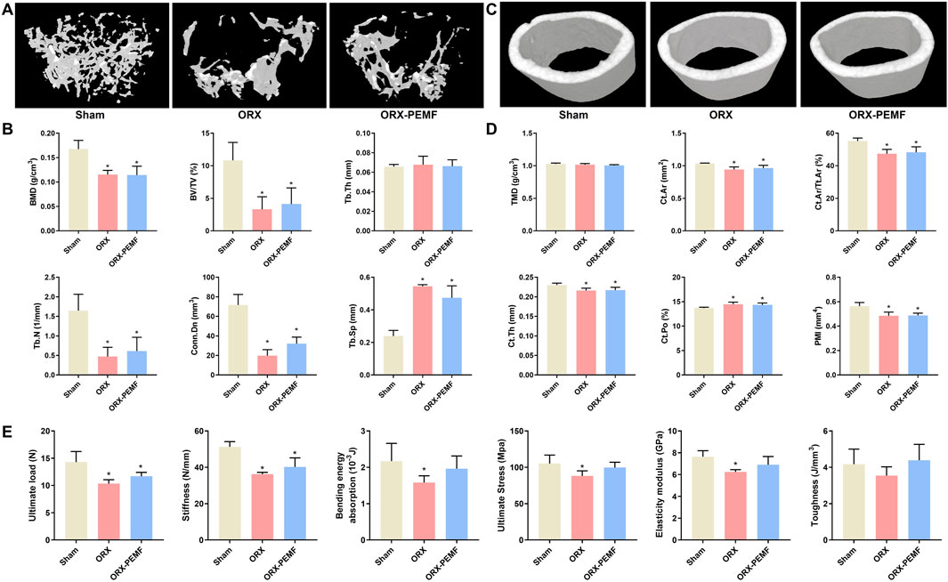 Figure 1. Effects of pulsed electromagnetic field (PEMF) application on femoral microstructure and tibial biomechanics in orchiectomy (ORX) mice. (A) Three-dimensional images of trabecular bone. (B) Bone mineral density (BMD) and structural parameters of trabecular bone, including bone volume fraction (BV/TV), trabecular thickness (Tb.Th), trabecular number (Tb.N), connectivity density (Conn.D), and trabecular separation (Tb.Sp). (C) Three-dimensional images of cortical bone. (D) Tissue mineral density (TMD) and structural parameters of cortical bone, including cortical area (Ct.Ar), cortical area fraction (Ct.Ar/Tt.Ar), cortical thickness (Ct.Th), cortical porosity (Ct.Po), and polar moment of inertia (PMI). (E) Biomechanical properties of the tibia, including ultimate load, stiffness, bending energy absorption, ultimate stress, elastic modulus, and toughness, were examined via three-point bending tests. The data are shown as mean ± SD (n = 8). *p < 0.05 vs. sham.