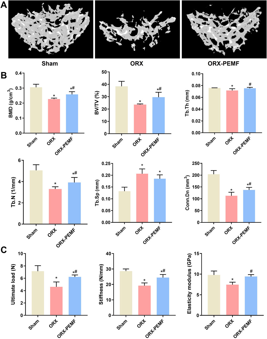 Figure 2. Effects of PEMF application on bone microstructure and biomechanics in the lumbar vertebra. (A) Three-dimensional images of trabecular bone. (B) Bone mineral density (BMD) and structural parameters of trabecular bone, including bone volume fraction (BV/TV), trabecular thickness (Tb.Th), trabecular number (Tb.N), connectivity density (Conn.D), and trabecular separation (Tb.Sp). (C) Biomechanical properties of the lumbar vertebra were evaluated, including ultimate load, stiffness, and elastic modulus. The data are shown as mean ± SD (n = 8). *p < 0.05 vs. sham, #p < 0.05 vs. ORX.