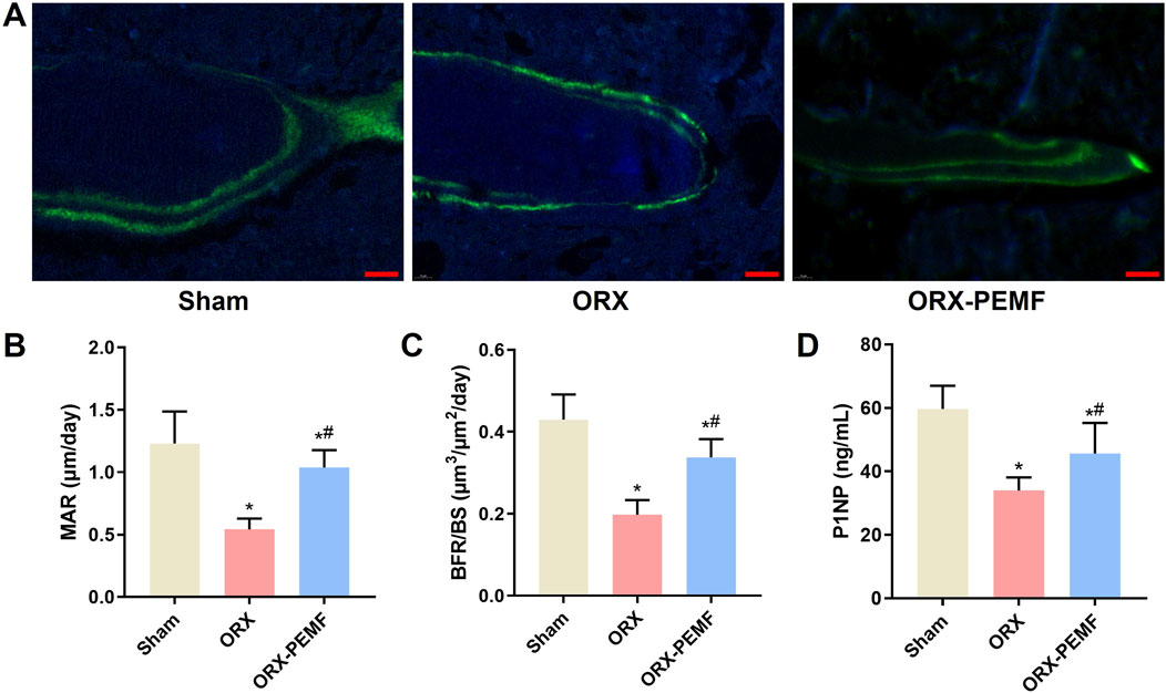 Figure 3. Effects of PEMF application on bone formation in ORX mice. (A) Representative images of bone formation marked by double-calcein labeling in the trabecular bone of the lumbar vertebra. Scale bar = 20 μm. Calculated values of the (B) mineral apposition rate (MAR), (C) bone formation rate (BFR/BS), and (D) concentration of serum type I procollagen N-terminal peptide (P1NP). The data are shown as mean ± SD (n = 8). *p < 0.05 vs. sham, #p < 0.05 vs. ORX.