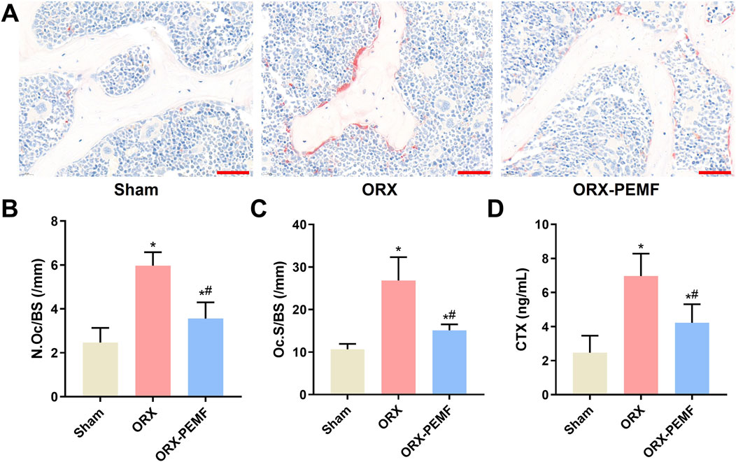 Figure 4. Effects of PEMF application on bone resorption in ORX mice. (A) Lumbar vertebra samples were TRAP stained to visualize the osteoclasts. Scale bar = 50 μm. Calculated values of the (B) number of osteoclasts per bone surface (N.Oc/BS); (C) osteoclast surface per bone surface (Oc.S/BS); and (D) concentration of serum C-terminal telopeptide of type I collagen (CTX). The data are shown as mean ± SD (n = 8). *p < 0.05 vs. sham, #p < 0.05 vs. ORX.