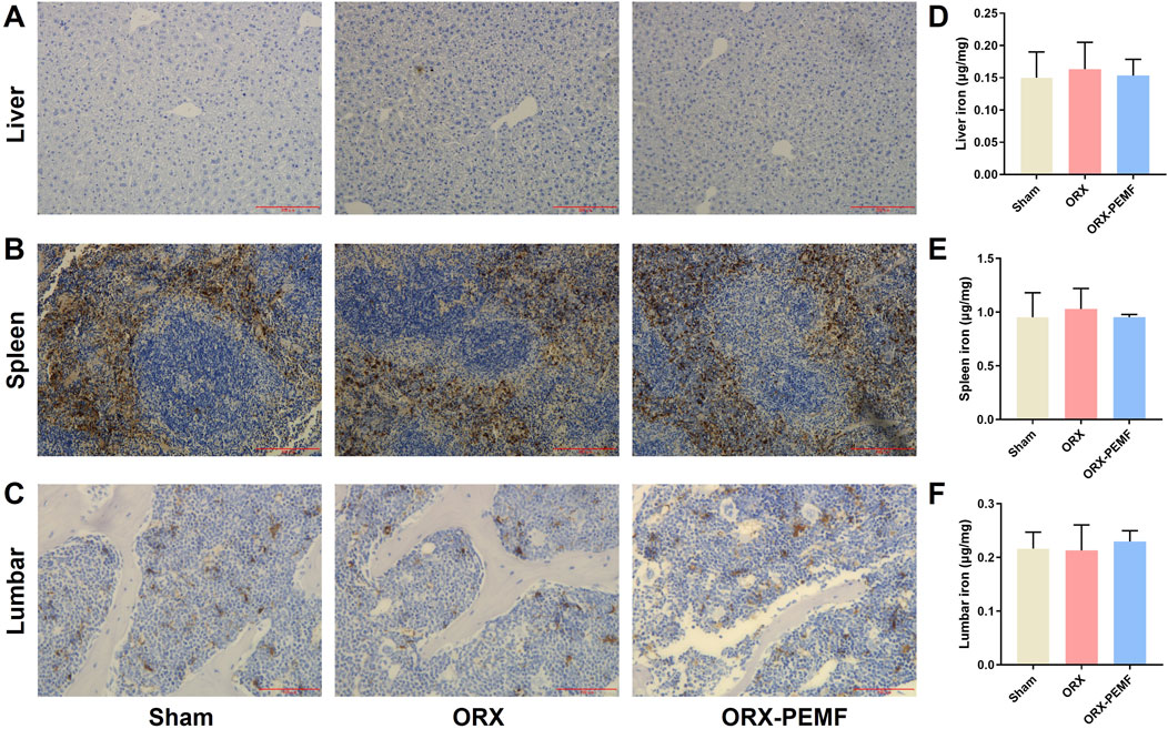 Figure 5. Effects of PEMF application on iron deposition in ORX mice. (A–C) Representative images of DAB-enhanced Prussian blue staining of the liver (scale bar: 200 μm), spleen (scale bar: 200 μm), and lumbar vertebra (scale bar: 100 μm), respectively. (D–F) Iron contents of the liver, spleen, and lumbar vertebra, respectively. The data are shown as mean ± SD (n = 8).