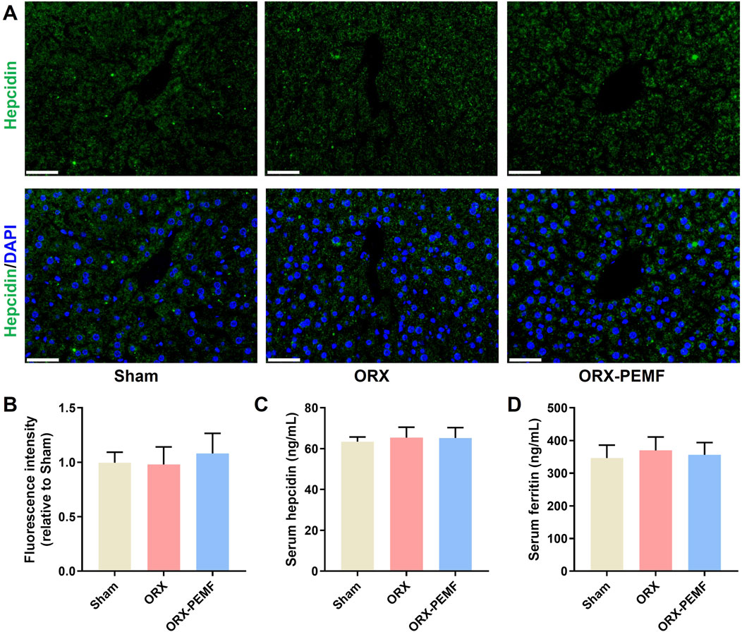 Immunofluorescence staining of the liver tissue for hepcidin showed that the ORX procedure did not affect hepatic hepcidin expression and that PEMF exposure did not cause significant changes in the liver hepcidin expressions in ORX mice (Figures 6A,B). The ORX procedure did not cause significant changes in the serum levels of hepcidin or ferritin in the mice (Figures 6C,D), and PEMF exposure also had no significant effects on these serum markers. These results demonstrate that PEMF application did not impact systemic iron metabolism in the ORX mice.