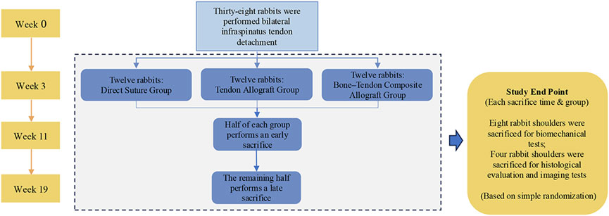 Thirty-six adult male New Zealand white rabbits (24 weeks; mean weight: 3–3.5 kg) were used in this study. The study was approved by the Medical Science Research Ethics Committee of Peking University and was carried out in strict accordance with all regulations. Accordingly, all rabbits underwent bilateral detachment of the infraspinatus tendon, and tendon repairs were performed three weeks later in these animals. The animals randomly underwent either a DS, only a tendon allograft (TA), or a bone–tendon composite allograft (BTA) in each shoulder. Eighteen rabbits were each sacrificed at 8 and 16 weeks after these repairs; twelve of the eighteen rabbits sacrificed at each timepoint were used for the biomechanical tests, while the remaining six were used for histological evaluations and imaging tests. The detailed information regarding the procedures is listed in Figure 1.