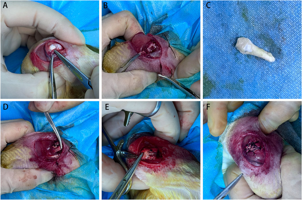 Following surgery, the muscles were sutured, and the wound was closed with interrupted sutures. The postoperative care included providing the rabbits with sufficient cage space, food, and water, along with a 7-day course of penicillin G (400,000 U) to prevent infections.