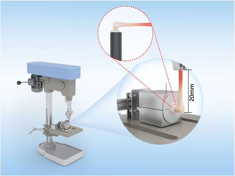 Figure 3. Schematic illustration of the biomechanical test setup. The rabbit humerus was embedded in a polyvinyl chloride (PVC) cylinder and fixed with plaster before mounting on the testing base. The tendon end was secured in a pneumatic grip to prevent slippage during loading. The angle between the humeral shaft and tendon was maintained at 90°, corresponding to the physiological pull direction of the infraspinatus. The initial gauge length (L0), defined as the distance from the humeral fixation site to the grip, was set to 20 mm.