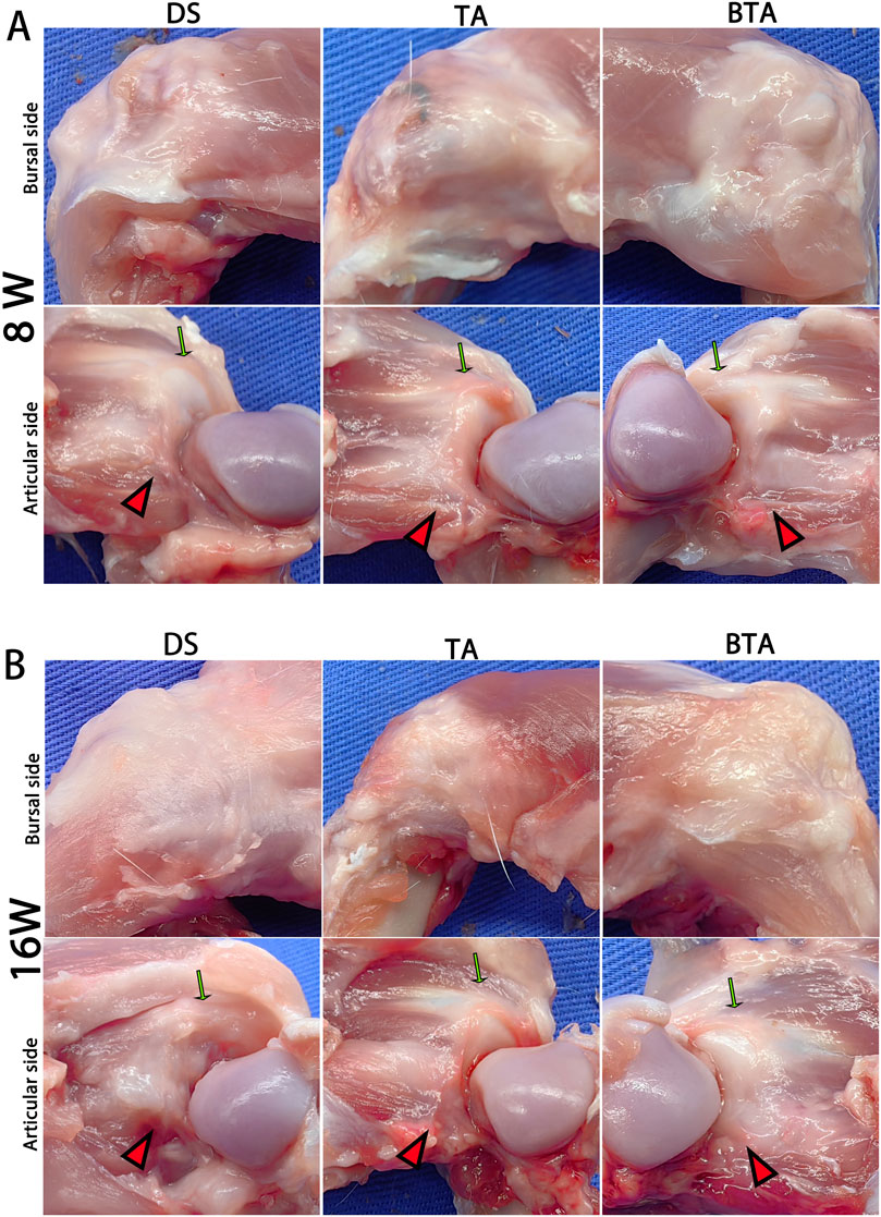 Figure 4. Gross observations on the bursal and articular sides of the specimens at (A) 8 and (B) 16 weeks postoperatively. The green arrows indicate the intact original supraspinatus tendon, while the red triangles indicate the sutured infraspinatus tendon or graft substance. DS, direct suture group; TA: tendon allograft group; BTA, bone–tendon allograft group.