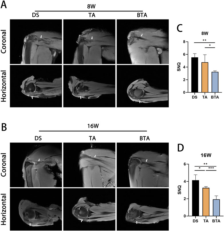 Figure 5. Representative magnetic resonance imaging scans of the direct suture (DS), tendon allograft (TA), and bone–tendon allograft (BTA) groups at (A) 8 and (B) 16 weeks postoperatively. Different representative slices were selected owing to anatomical variability. The mean signal-to-noise quotient (SNQ) values for the DS, TA, and BTA groups are shown at (C) 8 and (D) 16 weeks postoperatively. All data are presented as mean ± SD. *p < 0.05; **p < 0.01; ***p < 0.001.