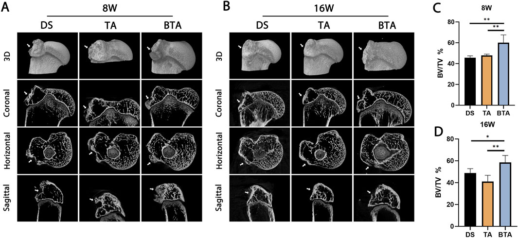 Figure 6. Representative micro-CT scans of the DS, TA, and BTA groups at (A) 8 and (B) 16 weeks postoperatively. The mean bone volume/total volume (BV/TV) values for the DS, TA, and BTA groups are shown at (C) 8 and (D) 16 weeks postoperatively. All data are presented as mean ± SD. *p < 0.05; **p < 0.01; ***p < 0.001.