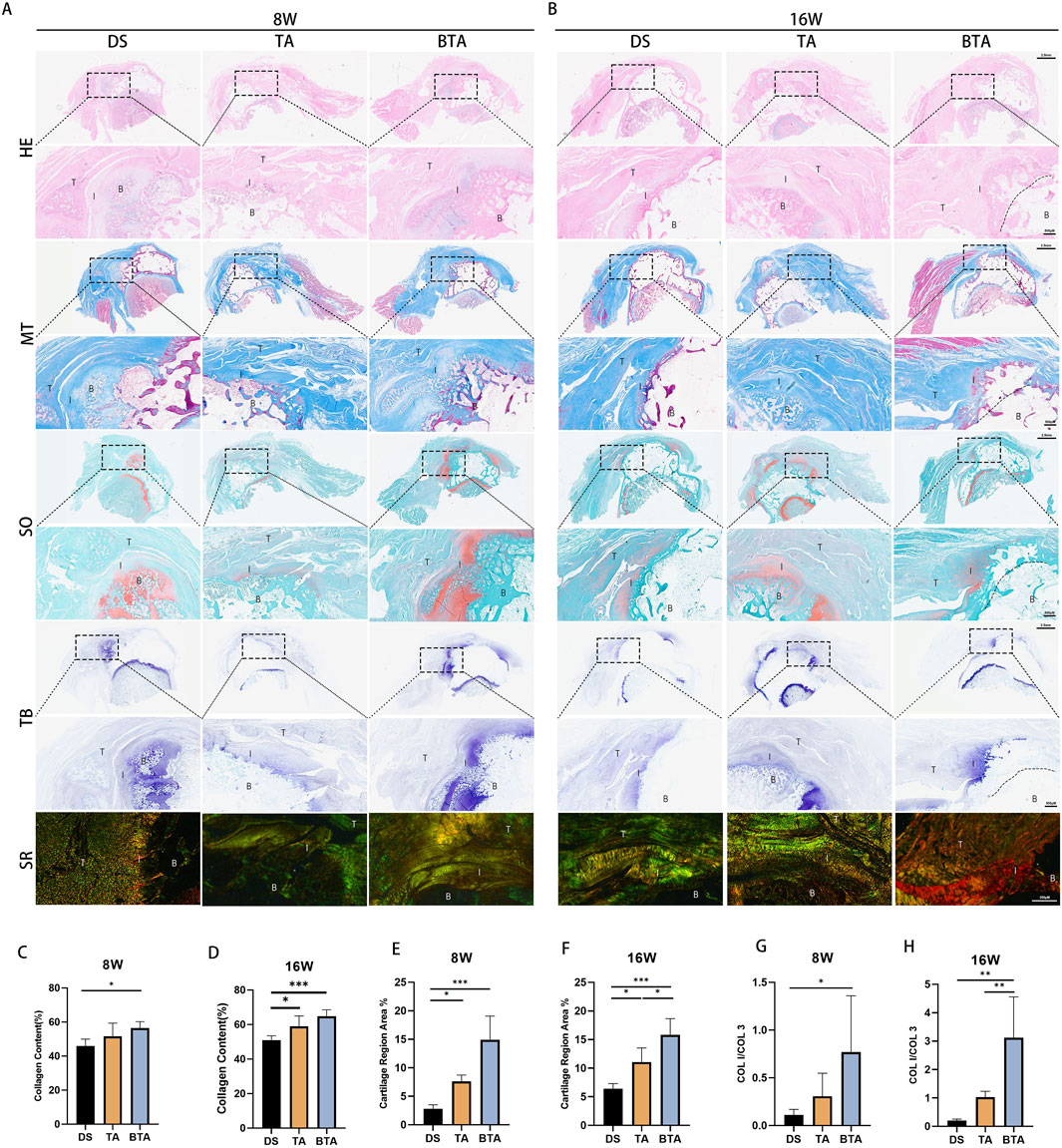 Figure 7. Histological results of the interface regions for the three groups. Representative images of the infraspinatus tendon enthesis stained with hematoxylin and eosin (HE), Masson’s trichrome (MT), safranin O/fast green (SO/FG), toluidine blue (TB), and sirius red (SR) at (A) 8 and (B) 16 weeks postoperatively. B, bone; I, interface; T, tendon. The mean collagen contents (%) for the DS, TA, and BTA group are shown at (C) 8 and (D) 16 weeks postoperatively. The mean fibrocartilage region areas (%) for the DS, TA, and BTA groups are shown at (E) 8 and (F) 16 weeks postoperatively. The mean COL I/COL III values for the DS, TA, and BTA groups are shown at (G) 8 and (H) 16 weeks postoperatively. All data are presented as mean ± SD. *p < 0.05; **p < 0.01; ***p < 0.001 (one-way analysis of variance).