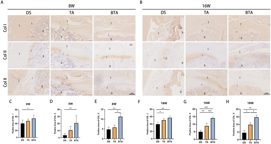 Figure 8. Immunohistological results of the interface regions of the three groups. Representative images of immunohistochemical staining for collagen types I, II, and X (COL I, II, and X, respectively) at (A) 8 and (B) 16 weeks postoperatively. B, bone; I, interface; T, tendon. (C–E) Statistical charts of the positive areas of (C) COL I, (D) COL II, and (E) COL X at 8 weeks postoperatively. (F–H) Statistical charts of the positive areas of (F) COL I, (G) COL II, and (H) COL X at 16 weeks postoperatively. All data are presented as mean ± SD. *p < 0.05; **p < 0.01; ***p < 0.001 (one-way analysis of variance). DS, direct suture; TA, tendon allograft; BTA, bone–tendon allograft.