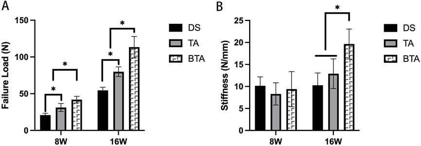The biomechanical results (Figure 9) show that at week 8, the ultimate load to failure of the specimens in the DS group were significantly lower than those in the TA (p = 0.000) and BTA (p = 0.000) groups. At this timepoint, the differences in stiffness among the three groups of specimens were not significantly different. At week 16, the ultimate load to failure of the specimens in the TA (p = 0.000) and BTA (p = 0.000) groups were significantly higher than those in the DS group. Furthermore, the ultimate load to failure of specimens in the BTA group were much higher than 100 N and were statistically different compared to the TA group (p = 0.005). At this timepoint, the specimen stiffness values in the BTA group were significantly higher than those in the DS (p = 0.000) and TA (p = 0.000) groups.