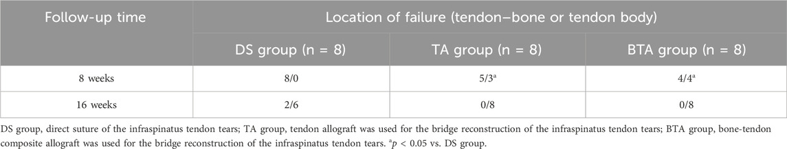 As shown in Table 1, 8 weeks after the surgery, the failure site was at the TBI for all cases in the DS group. However, there were only five cases for the TA (p = 0.028) and four cases for the BTA (p = 0.005) groups where the failure site was at the TBI. At week 16, there were no cases of torn grafts at the TBI for both the TA and BTA groups. Furthermore, although there were more interface failure cases in the DS group at week 16, the differences were not significant.