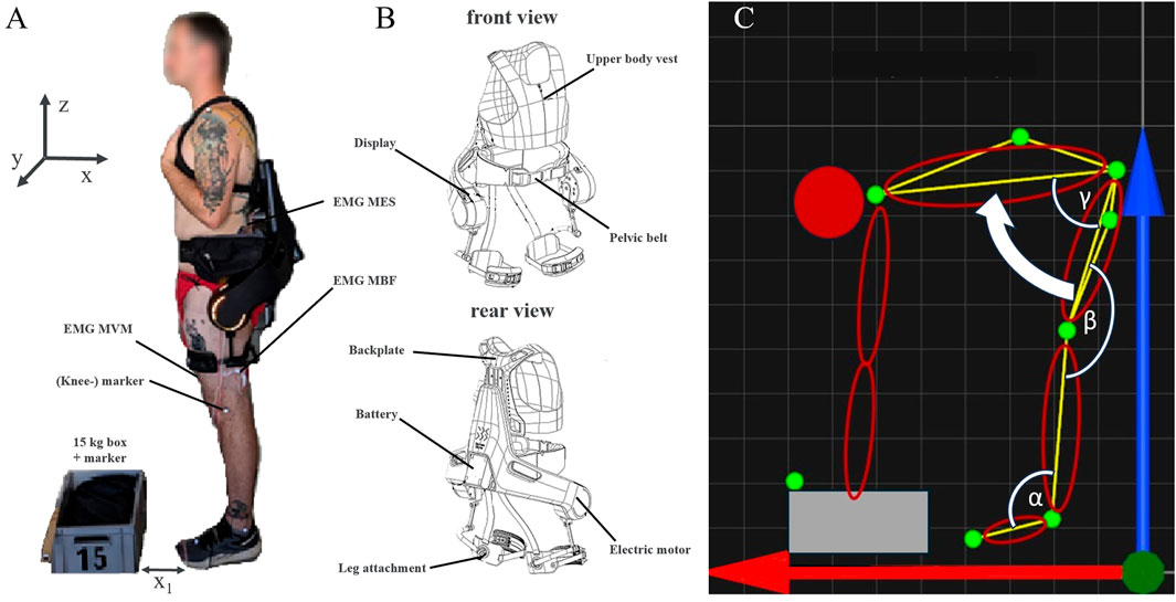 Figure 1. (A) Subject wearing the Apogee exoskeleton in front of the 15 kg box. x1 represents the horizontal distance between the participant and the load (about 15 cm). The box has the dimensions (40 × 30 × 22 cm) and lies with its short side in the direction of the sagittal axis (x) of the body. The box was grasped by the side handles with both hands. No gloves were worn. The initial and final height of the load were 0 cm and 64.2 ± 4.1 cm, respectively. Both feet were parallel to each other with a distance of about 20 cm. The reflective markers (white spheres) are labelled as an example for the knee joint. The positions of the EMG electrodes are indicated for the MES, MBF and MVM. (B) Schematic illustration of the Exoskeleton “Apogee” used in this study. (C) Schematic representation of the stoop-technique. The main movement is indicated by the white arrow. The green dots correspond to the positions of the optical markers. Red (x) and blue (z) arrows indicate the horizontal and vertical directions, respectively. The calculated joint angles are marked in white: α–ankle, β–knee, γ–hip.