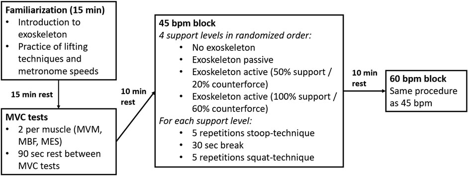 The schematic structure of the study procedure can be seen in Figure 2. At the beginning of the experiment two maximum voluntary contraction (MVC) tests were conducted for each muscle (Gruber et al., 2009). Between the MVC measurements the subjects had a break of 90 s, after the MVC measurements a break of 10 min. Then, the subjects were instructed to lift a 15 kg box (40 × 30 × 22 cm) five times with each speed and level of support from the ground to standing upright. The chosen weight was in line with previous studies using similar experimental designs (Huysamen et al., 2018; Walter et al., 2023), ensuring comparability of the results. The stoop-technique was evaluated throughout this study, which is characterized by slightly bended or straight knees and a forward bend of the trunk (Figure 1). The order of the conditions was randomized but the subjects either started or ended the experiment without the exoskeleton. This ensured that there were no complications with the cable driven EMG device while putting the exoskeleton on or taking it off during the experiment. Each condition started with five repetitions using the stoop-technique. After a 30 s break, five repetitions using the squat technique were performed. A five-minute rest period was provided between each condition to minimize fatigue. After completing all conditions with 45 bpm, the subjects took a ten-minute break before repeating all conditions with 60 bpm. The lifting speed was controlled using a metronome, whereby each part of the movement (bending down, lifting the box, standing still with the box, bending down and placing box, straighten up) had to be done in one beat. To ensure correct handling of the exoskeleton and familiarize with the different lifting speeds and techniques, the subjects were introduced to the exoskeleton and had a 15-min familiarization session prior to the start of the experiment. Following this, the participants rested for 15-min to avoid fatigue effects.