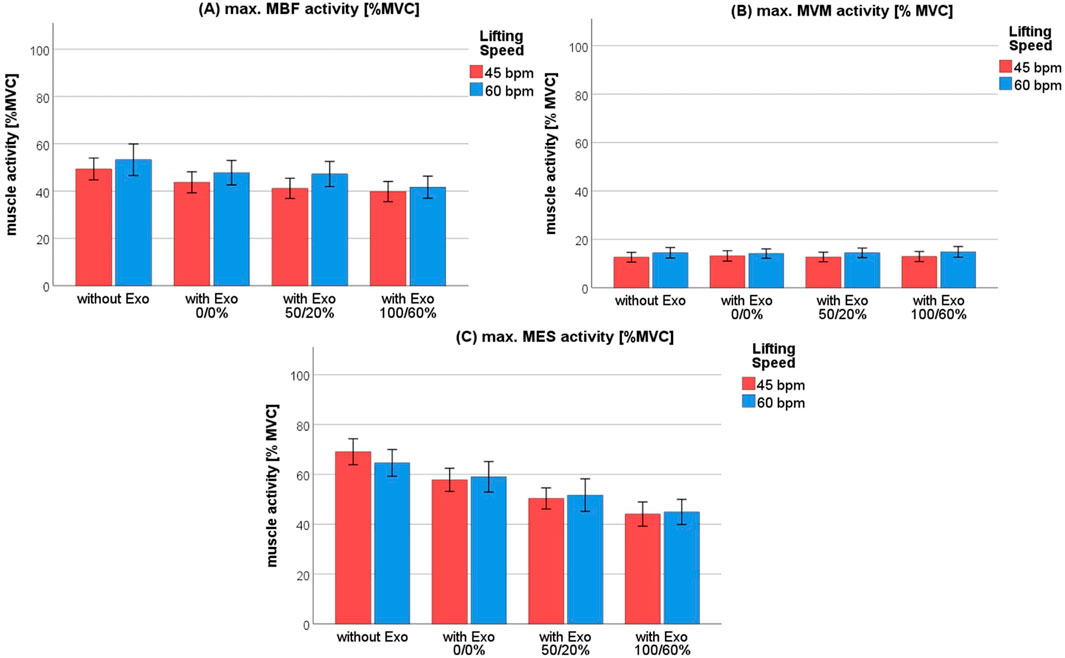Discussion: The decrease in MES activity of 22.3% MVC with full support suggests a potent reduction in spinal load. MBF activity increased less with higher speeds when support was applied. The MVM showed low and stable activity across all conditions. These findings suggest that the active exoskeleton Apogee provides support regardless of lifting speed and may help prevent MSDs in occupational settings. Users can adjust support levels based on task requirements and personal comfort.
