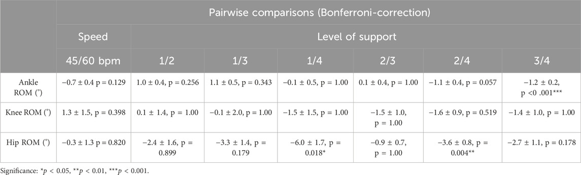 Table 2. Pairwise comparisons using the Bonferroni-correction for the ROM in the ankle, knee and hip joint.