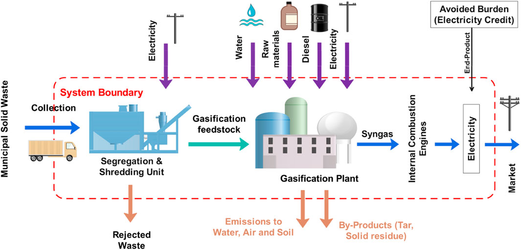 Goal and scope are the initial steps in any LCA study, as they clearly define the system boundary and limitations. The goal of the study was to assess the environmental and economic performance of syngas production from mixed MSW using a simulation-based LCA model. The broader objective was to examine how WTE technologies, mainly gasification, can reduce the risk of pandemic spread. It also aimed to evaluate circular economy strategies, particularly in the context of traditional systems disrupted by the public health crisis.