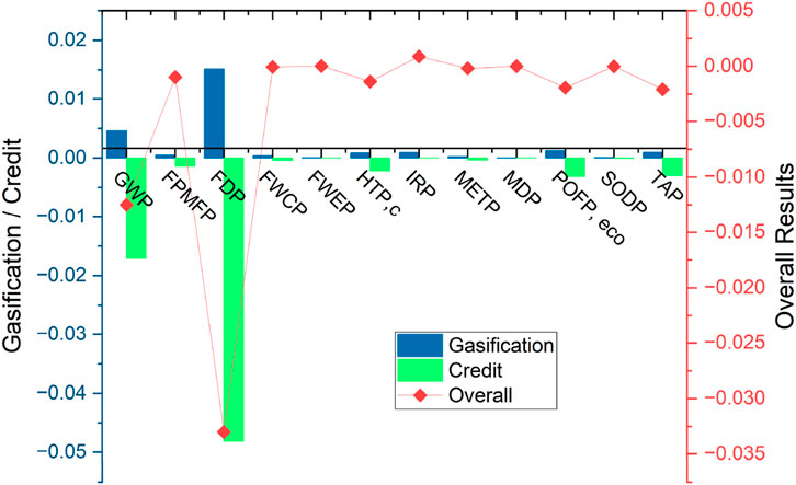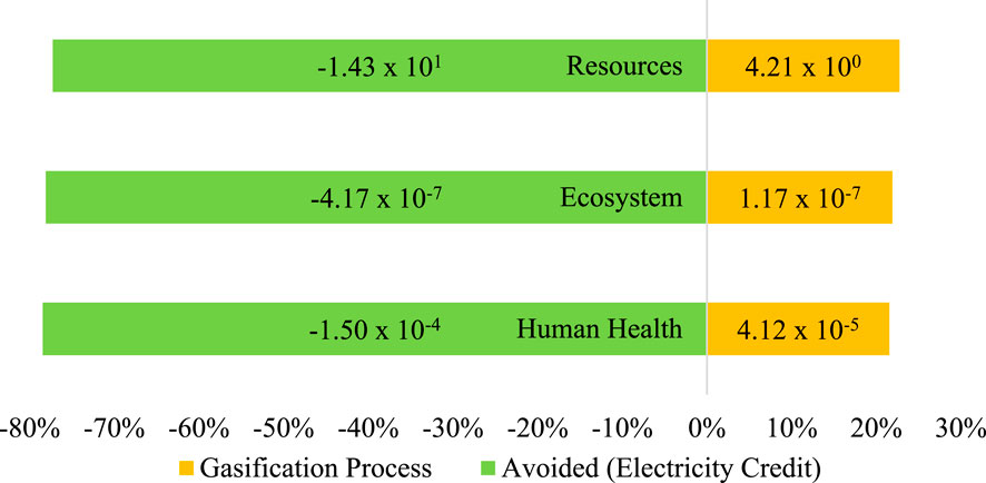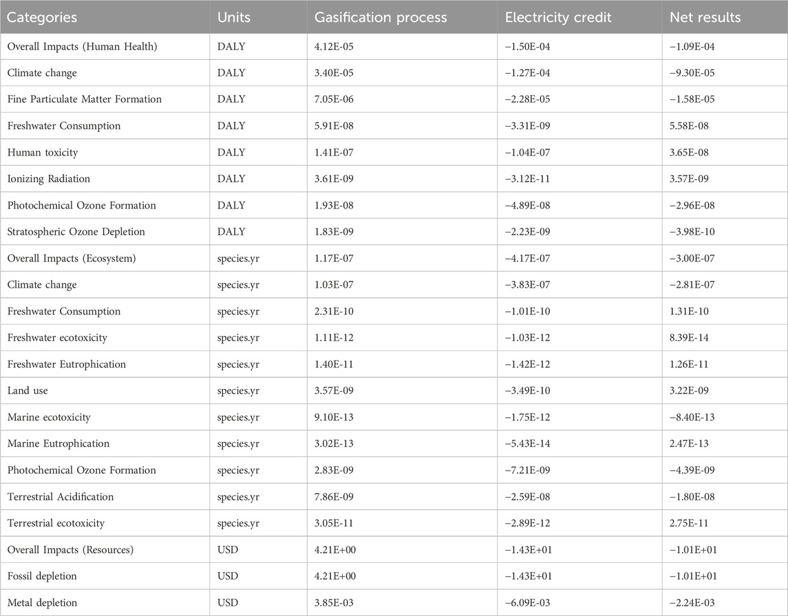 The endpoint indicators were calculated to assess the broader damage impacts across human health, ecosystems, and resource availability using the ReCiPe 2016 method. As shown in Table 3, the results represented a combination of direct gasification process burdens and environmental benefits resulting from electricity substitution. For human health, the total net impact was found to be −1.09E–04 DALY, indicating an overall benefit. Climate change was the leading contributor here, with 3.40E–05 DALY from gasification offset by −1.27E–04 DALY in credit, giving a net benefit of −9.30E–05 DALY. Other relevant categories, like fine particulate matter formation and photochemical ozone formation, showed smaller net health effects of −1.58E–05 and –2.96E–08 DALY, respectively. Human toxicity showed a marginal net increase (3.65E–08 DALY), while freshwater consumption and ionizing radiation also reflected small positive balances.