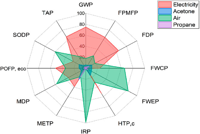 Propane and acetone played more specific roles. Propane had higher contributions in categories like FDP (6.3%) and METP (19.9%), likely due to its fossil-based origin and toxic emissions during startup. Acetone showed peak impacts in IRP (98.6%) and POFP (11.4%), reflecting the upstream processing burden of solvent production. In HTPc and METP, acetone and propane together contributed over 35% of the impact. Interestingly, TAP and POFPeco were relatively more balanced across inputs, with electricity remaining the dominant contributor; however, other inputs, such as air and solvents, had noticeable shares.