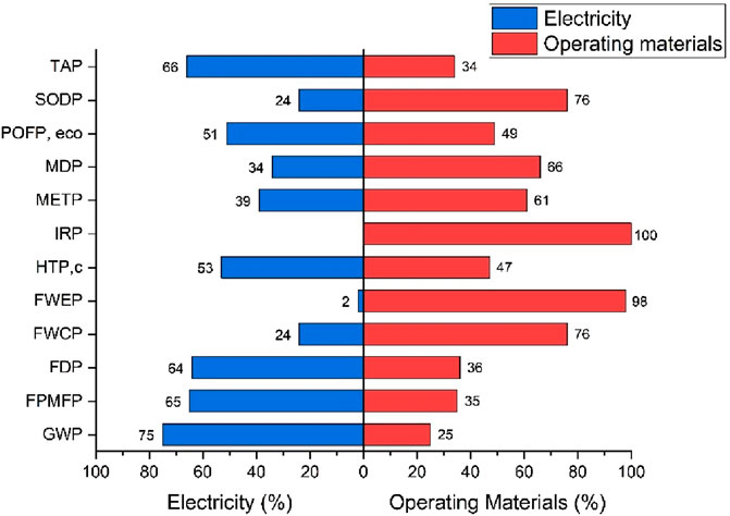 In addition to the detailed contribution analysis presented in Section 3.4, a comparative evaluation was conducted to quantify the relative contributions of electricity and operating materials across the midpoint environmental impact categories. This analysis aimed to deepen the understanding of input-specific burdens, with a particular focus on identifying the dominant environmental drivers among foreground activities. Figure 5 presents a visual breakdown of the percentage share of electricity (shown in blue) versus all operating materials (shown in red) across 12 selected midpoint categories. Results reveal that electricity is the most significant contributor in several categories, including GWP (75%), FPMFP (65%), and FDP (64%). These outcomes underscore the environmental intensity of electricity use in the gasification and pre-processing stages, even when the electricity is partially offset through recovery from syngas.
