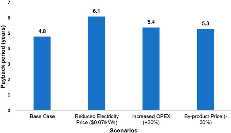A sensitivity analysis was also conducted to assess financial robustness under various market scenarios. If the electricity price dropped to USD 0.07/kWh, the payback period would extend to 6.1 years, and NPV would decrease to USD 150,000. In a scenario where operating and maintenance costs increase by 20%, the payback period would shift to 5.4 years, still within an acceptable range, as shown in Figure 6. In a scenario with a 30% decrease in the price of tar (to $0.21/kg) and solid residue (to $0.035/kg), the total annual revenue would decrease to $473,568. This would extend the payback period to 5.3 years and lower the NPV to approximately $350,000. A scenario assuming no market value for tar was analyzed to test an extreme boundary condition. This resulted in a payback period of 5.8 years and an NPV of $280,000. While this extends the payback, but the project remains financially viable, demonstrating a strong buffer against the complete failure of the tar market. Conversely, a 30% price increase would shorten the payback period to 4.4 years. This analysis confirms that the project’s economic viability is robust to fluctuations in by-product markets, maintaining a compelling financial case even under conservative assumptions.