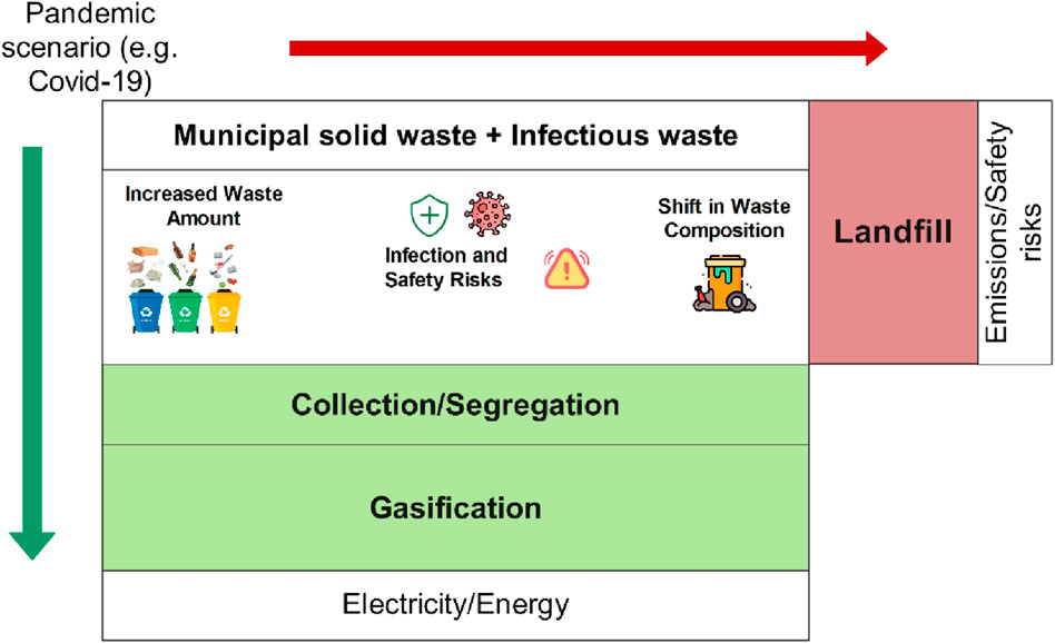 The coronavirus disease 2019 (COVID-19) pandemic exposed several shortcomings and constraints across global socio-economic, healthcare, and environmental systems (Nzediegwu and Chang, 2020). Millions of people suffering from this pandemic face serious health problems, and it has been linked to approximately 6.9 million deaths globally (Yousefi et al., 2021). Concurrently, the pandemic has brought short-term environmental benefits, including decreased air pollution, reduced noise, and enhancements in biodiversity and tourism sites.- Poorly managed waste can become a breeding ground for pathogens, increasing the risk of disease spread and environmental pollution, posing significant risks, as witnessed during the COVID-19 outbreak. Improper disposal and handling of escalating waste raised public concerns about potential secondary transmission routes and highlighted broader vulnerabilities in waste management systems (Sarkodie and Owusu, 2021). Practices such as open burning or uncontrolled incineration degrade air quality and pose severe health risks due to exposure to hazardous materials. Approximately 85%–90% of waste sent to open landfills typically causes severe environmental and health problems (Ouda et al., 2016). The problem of waste mismanagement underscores an urgent need to transition from landfilling to advanced waste-to-energy (WTE) technologies for the production of value-added products.