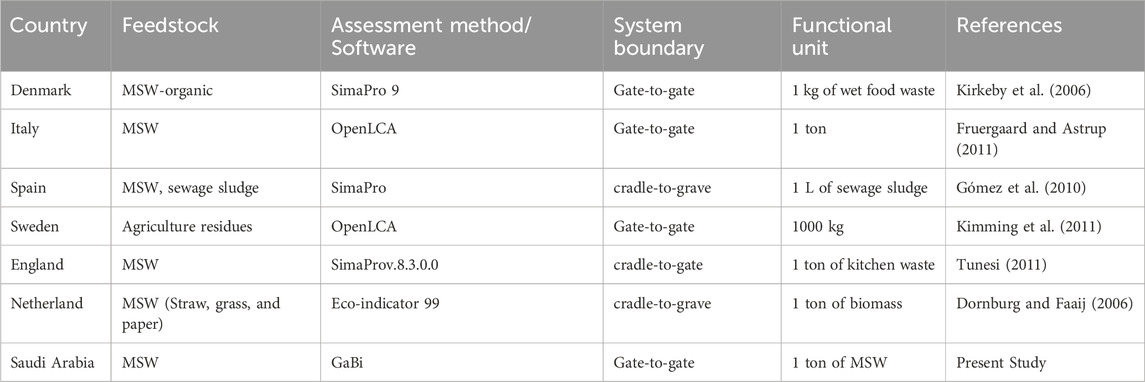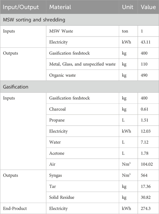Finally, in the modeled recovery phase, syngas was assumed to generate 274.3 kWh of electricity. All values were based on secondary sources, the GaBi database, and regionally applicable modeling assumptions (Nzediegwu and Chang, 2020; Javed et al., 2025a; Ouedraogo et al., 2021). One of the critical challenges while performing LCA is ensuring that the data collected, whether from the field or published literature, is accurate and reliable enough (Olanrewaju et al., 2024). Waste composition data were taken from local records, while operational assumptions were mainly derived from published studies and GaBi process datasets. The system was modeled as a network of interlinked flows, where each input and output is part of a larger material balance. Table 1 provides a comprehensive overview of all inputs that entered the system from the environment, as well as the main outputs that were released or recovered during every step of the process. This structure ensures that the simulation remains consistent, balanced, and robust enough for a detailed environmental evaluation.