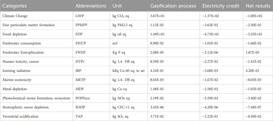 A life cycle impact assessment was conducted to evaluate the environmental impacts associated with syngas production and electricity generation using GaBi version 10.0.0.71. The ReCiPe Midpoint (H) 2016 method was selected for environmental impact assessment. This is a reliable standard for environmental impact assessment due to its wide acceptance and comprehensive coverage of impact categories (Raluy and Dias, 2021; Life cycle assessment, 2025; Goedkoop and Heijungs, 2025). This method categorizes environmental impacts into 18 distinct categories, each linked to specific impacts (Huijbregts et al., 2017; Dong and Ng, 2014). Only twelve impact categories were selected based on the relevance of syngas production and electricity generation from MSW gasification.