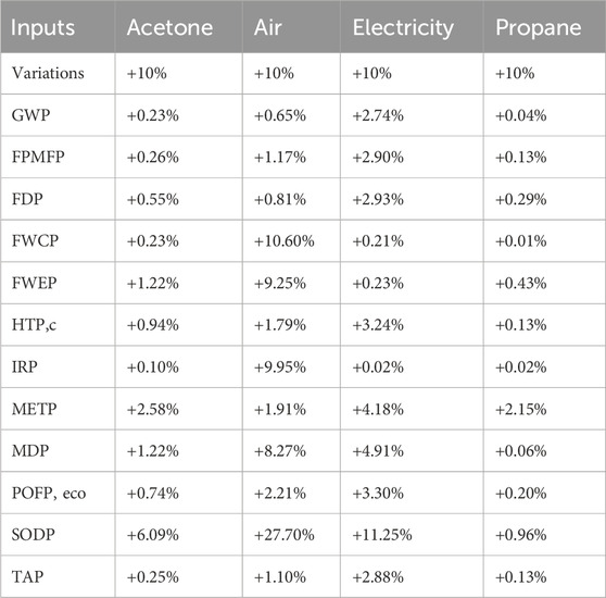 The air input had a significant impact, particularly in freshwater-related categories, with FWCP increasing by +10.60%, FWEP by +9.25%, and IRP by +9.95%. POFP also changed by +2.21%, and METP by +1.91%. These results suggest that air compression and circulation, as modeled through GaBi databases, have energy demands that result in indirect emissions through multiple impact pathways. Acetone exhibited moderate changes in categories such as METP (+2.58%), MDP (+1.22%), FWEP (+1.22%), and POFP (+0.74%). Notably, this led to the highest variation in SODP at +6.09%, likely due to the chemical precursors involved in solvent manufacturing. Although the absolute quantity of acetone in the process was low, its upstream chemical intensity still made a measurable impact.