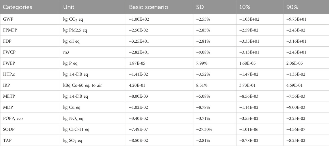 A Monte Carlo simulation was performed to assess the uncertainty and variability across selected midpoint categories. The model employed probabilistic sampling to estimate the 10th and 90th percentile bounds and standard deviation (SD) for each impact result based on the system inputs and their associated background datasets. The basic scenario results are listed in Table 5, along with the spread ranges, which demonstrate the model’s robustness under small fluctuations. Most categories showed low to moderate uncertainty. For example, GWP had a basic value of −1.00E+02 kg CO2 eq., with a standard deviation of −2.55%. Its 10th and 90th percentile results were −1.03E+02 and −9.73E+01 kg CO2 eq., which shows narrow variability and a stable central trend. FPMFP and FDP also showed tight ranges with SDs of −2.85% and −2.81% respectively.
