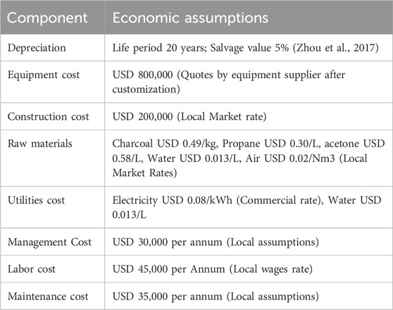 Economic modeling was conducted to assess the economic viability of producing syngas using a combined approach of life cycle costing (LCC) and economic performance indicators. The LCC included the total internal costs (IC) and external costs (EC) (Zhou et al., 2021; Ahmad et al., 2025). Hence, the IC includes both initial capital investment (ICI) and operational costs. The ICI cost comprises the purchasing and construction costs. Moreover, operational costs included depreciation costs (Cd), raw material costs (Cr), utility costs (Cu), management costs (CM), labor costs (Cl), and maintenance costs (Cm) (Lv et al., 2019; Musharavati et al., 2025). The IC was projected using the following Equation 1.