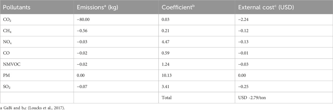 Therefore, during various phases of the life cycle process, the external cost signifies direct and indirect emissions into the environment. These emissions were calculated by multiplying the emission rate by a specific coefficient derived by Pa et al. (2013), as defined in Equation 2.
