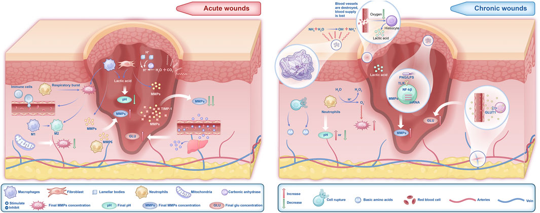Regardless of whether the wound is acute or chronic, changes in the microenvironment significantly influence the healing process (Kirchner et al., 2020), particularly the components such as pH, ROS, MMPs, and Glu levels (Figure 1). The microenvironment of acute wounds generally exhibits a lower pH. This acidity stems primarily from the glycolytic activity of macrophages and the Warburg effect in fibroblasts, processes that increase lactic acid production and consequently lower the pH (Barker et al., 2017; Mahanty, 2025). In contrast, chronic wounds typically have a higher pH, ranging from 7.3 to 8.9 (Wilson et al., 1979), due to bacterial biofilm formation, ischemia, and hypoxia. However, prolonged bacterial infections may result in a decline in wound pH. ROS levels are elevated in the early stages of acute wounds (Zhang et al., 2023a; Suzuki et al., 2011), where they effectively inhibit bacterial growth (Rodrigues et al., 2019). In chronic wounds, however, ROS levels remain persistently high. This sustained oxidative stress impairs critical healing processes, including macrophage transformation, collagen synthesis by fibroblasts, and angiogenesis, thereby delaying wound healing (Zhao et al., 2023; Xue et al., 2024; Deng et al., 2019; Li et al., 2021; Janda et al., 2016; Gouzos et al., 2020). Additionally, excessive ROS activity leads to the sustained secretion of MMPs, exacerbating inflammation and tissue degradation (Raziyeva et al., 2021; Daraban Bocaneti et al., 2022; Xing et al., 2017). Fluctuations in Glu levels also play a crucial role in wound healing. Elevated Glu levels in both acute and chronic wounds provide cellular energy, but they also increase the risk of infection and suppress the release of angiogenic factors, leading to impaired proliferation during the healing process (Dam and Paller, 2018). Therefore, changes in the wound microenvironment play a critical and undeniable role in the healing trajectory of wounds (Figure 2).
