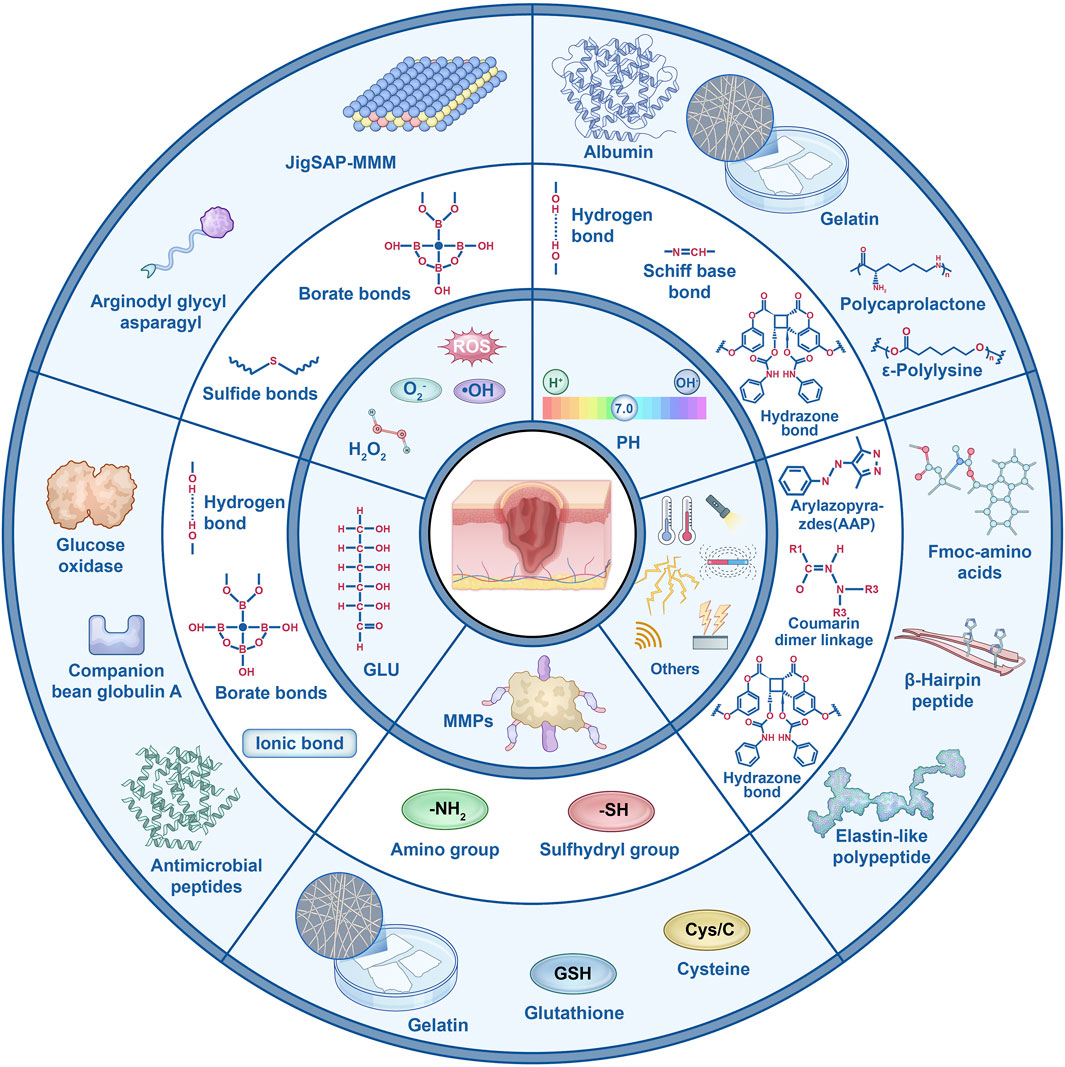 ROS are highly reactive ions generated in the human body as byproducts of aerobic respiration, including hydrogen peroxide, superoxide anions, and hydroxyl radicals (Tyagi et al., 2021). While ROS play an essential role in wound healing, their dual nature cannot be overlooked. In the early stages of healing, ROS contribute to infection control by eliminating pathogens. In the later stages, low concentrations of ROS stimulate the polarization of M2 macrophages, promoting tissue repair. However, excessive ROS levels can lead to prolonged inflammation and degradation of the extracellular matrix (ECM). This imbalance drives the wound into a chronic, non-healing state (Dunnill et al., 2017). Currently, ROS-responsive hydrogels can be broadly classified into two types. The first type involves the degradation of hydrogels in oxidative environments, altering their properties (e.g., drug release or swelling characteristics). Common responsive units in these systems include thioketal bonds, diselenide bonds, and boronate ester bonds. The second type of ROS-responsive hydrogels changes the solubility of the material (from hydrophobic to hydrophilic) in response to ROS oxidation, achieving the desired effect. These hydrogels typically contain responsive units such as thioether bonds and ferrocene (Saravanakumar et al., 2017).