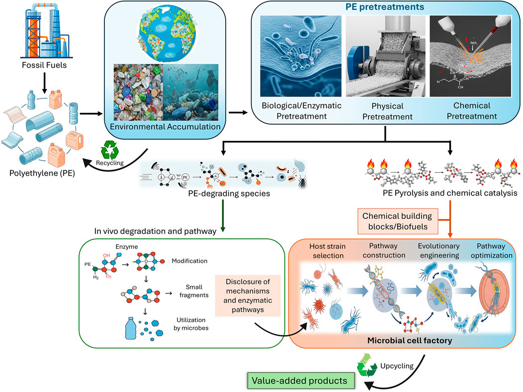 This review aims to provide a comprehensive analysis of the PE biorecycling pipeline. The critical role of pretreatment technologies for effective biological attack, the current state of enzymatic and microbial degradation, and the specific enzymes and microorganisms that have shown promise in breaking down PE are discussed in detail. While biodegradation is critical for biorecycling, we particularly emphasize the upcycling of PE-degradation products into value-added chemicals and biomaterials using metabolically engineered strains. The entire process, from virgin PE production and its environmental accumulation to its degradation and ultimate conversion into value-added chemicals through biological routes, is conceptualized in Figure 1, which serves as a visual map for the discussion to follow. The significant challenges and future perspectives in scaling up these bioprocesses have also been elaborated.