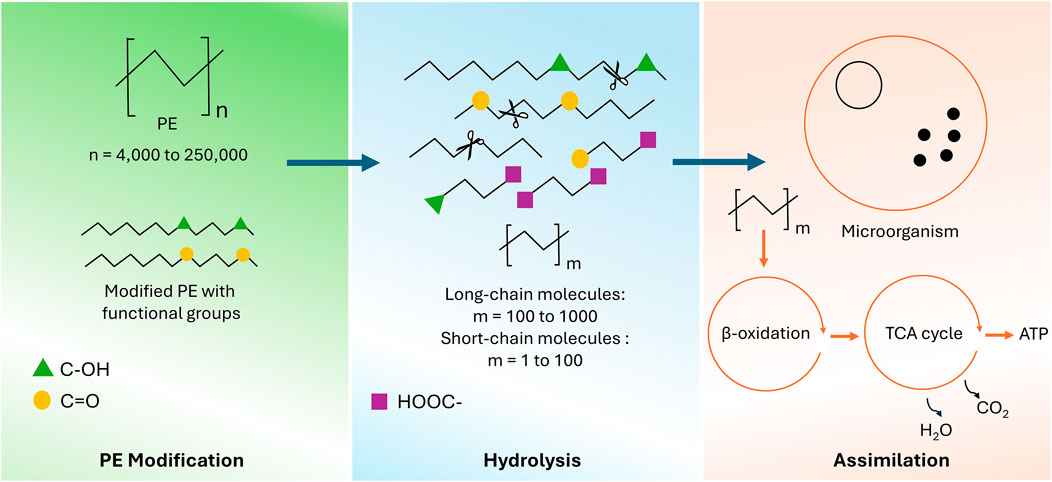 PE is a widely utilized, unreactive plastic material due to its high durability and great resistance. This high resistance of PE is owing to the exclusive C-C linear carbon atoms backbone and C-H covalent bonds that are highly stable (Ellis et al., 2021). This unique property of PE makes them highly durable during their use phase; however, it causes challenges in their recycling and upcycling (Lemmens et al., 2024). Furthermore, the molecular weight of PE, like high-density polyethylene (HDPE) with high molecular weight, poses a significant recycling and upcycling challenge by making it more complicated for oxidizing agents, enzymes, and microorganisms to access long and dense polymer chains (Sudhakar et al., 2008; Fontanella et al., 2010). Additionally, PE resistance to biodegradation is attributed to the tightly packed crystalline regions due to a high degree of crystallinity along with a low available specific surface area and high hydrophobicity (Burelo et al., 2023). These physical characteristics of PE can be modified using physicochemical and microbial pretreatment processes or a hybrid of both. Physicochemical pretreatment involves the addition of an oxidizing agent, hydrolysis reactions, UV exposure, and thermal treatment. These pretreatments alter the PE structure, surface features, and crystallinity, resulting in improved PE hydrophilicity, affinity to microbes, and reactive surface sites, therefore, leading to high PE biodegradation and upcycling (Restrepo-Flórez et al., 2014; Bardají et al., 2020; Burelo et al., 2023).