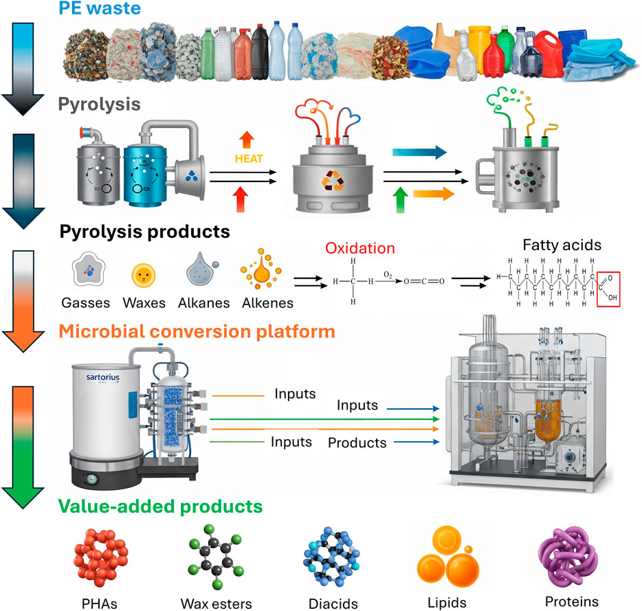 Biorecycling and upcycling have substantial advantages over conventional recycling methods and are part of the solution to the current plastic pollution crisis. Biorecycling starts from the use of enzymes and/or microorganisms to break down PE wastes, and the generated monomers or small molecules can be used as feedstocks for further microbial conversion into value-added products via biomanufacturing (Buragohain et al., 2020; Kawai, 2021; Gomes, 2022; Pellis et al., 2023; Patel et al., 2024). In this way, biorecycling promotes a circular economy while also providing an environmentally friendly way to lessen harmful plastics in our ecosystems (Elahi et al., 2021; Soong et al., 2022; Peng et al., 2023). PE is notoriously resistant to biodegradation due to its stable chemical structure. Pretreatment of PE has been found beneficial to help initiate the biodegradation process. Pretreatments can be achieved by chemical, physical, or biological/enzymatic means (Buragohain et al., 2020), which introduce reactive sites, reduce molecular weight, and increase hydrophilicity (Ciuffi et al., 2024). Pretreatments have proven to have a significant positive impact on PE biodegradation as well as its upcycling yield of value-added chemicals. UV pretreatment, one of the industrially applicable techniques, can alter structural, morphological, and molecular properties of PE films, as reported in the literature, resulting in 29.5% weight loss, as opposed to 15.8% without UV treatment, when exposed to mixed microorganisms (Lysinibacillus, Xylanilyticus, and Asperillus niger) for 126 days (Esmaeili et al., 2013). Rising concerns over the reproducibility of available studies on enzymatic and microbial PE degradation, coupled with criticisms of the analytical techniques adopted to demonstrate PE degradation, highlighted the need for more robust strategies (Jendrossek, 2024; Stepnov et al., 2024). Redirecting research efforts toward viable PE upcycling routes that produce value-added chemicals represents a promising and practical direction. Unlike traditional recycling, upcycling is a multistage process that typically involves PE breakdown into small molecules via pyrolysis or thermochemical methods and then transforming those molecules into high-value chemicals (Vanaraj et al., 2025). Depending on the microbial strain, value-added products from PE upcycling can include proteins (Byrne et al., 2022), polyhydroxyalkanoates (PHAs) (Guzik et al., 2021), waxes (Gregory et al., 2022), and long to medium chain diacids (Yeo et al., 2024). These value-added products can be used in cosmetics, biofuels, pharmaceuticals, and textiles (Huf et al., 2011; Inui et al., 2017; Sharma et al., 2021).