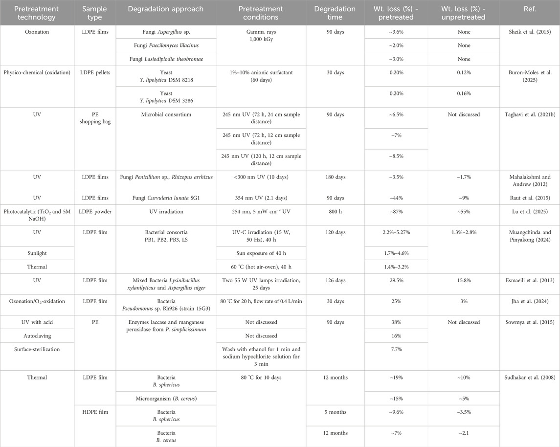 Pretreatment using ultraviolet (UV) radiation is considered one of the most environmentally friendly pretreatment techniques. The exposure of PE to UV results in the generation of oxygen-free radicals within the PE chains, which can take part in the polymeric chain reaction pathways (initiation, propagation, and termination) to result in the formation of comparatively shorter chain molecules, including olefin and ketones (Vasile and Pascu, 2005; Gewert et al., 2015; Erdmann et al., 2020). These small molecules, as a result of photo-oxidation, are then more easily accessible to be attacked by microbial enzymes for further consumption and degradation (Taghavi et al., 2021b). Furthermore, higher microbial colonization and improved hydrophilicity of PE were also observed by UV radiation pretreatment (Suresh et al., 2011; Ciuffi et al., 2024). The UV oxidation mechanism of plastic has been well-studied in past studies (Gewert et al., 2015; Taghavi et al., 2021a; Taghavi et al., 2021b). However, several studies also reported sunlight as a UV pretreatment and degradation method (Abd El-Rehim et al., 2004; Gong et al., 2019). Comparative studies conducted by Doğan (2021) demonstrated higher degradation of PE using artificial UV light in a shorter time compared to sunlight. Even with a general agreement on weathering and PE oxidation under sunlight, the low-energy UV from the sun is not as effective as the higher-energy UV from the artificial UV radiation sources (Jones, 2002; Doğan, 2021). UV treatment of LDPE sheets for 2.1 days with 354 nm UV resulted in the improvement of their degradation (weight loss) from 9% to 44% in 90 days by the fungi Curvularia lunata SG1 (Raut et al., 2015). An increase from 15.8% to 29.5% in the biodegradation of LDPE films was reported by mixed bacteria in 126 days after pretreatment of LDPE films using 55 W UV lamps irradiation for 25 days (Esmaeili et al., 2013). For the upcycling of PE into value-added products, the study revealed that the UV light treatment of LDPE powder enhanced its bioconversion by Cupriavidus necator H16, which was able to accumulate poly(3-hydroxybutyrate-co-3-hydroxyvalerate) (PHB-V) up to 3.18% ± 0.4% of cell dry mass (Montazer et al., 2019). Table 1 shows several PE microbial degradation studies using UV-pretreated PE, summarizing PE weight loss (%) performance with several microbial strains under different PE UV-pretreatment conditions.