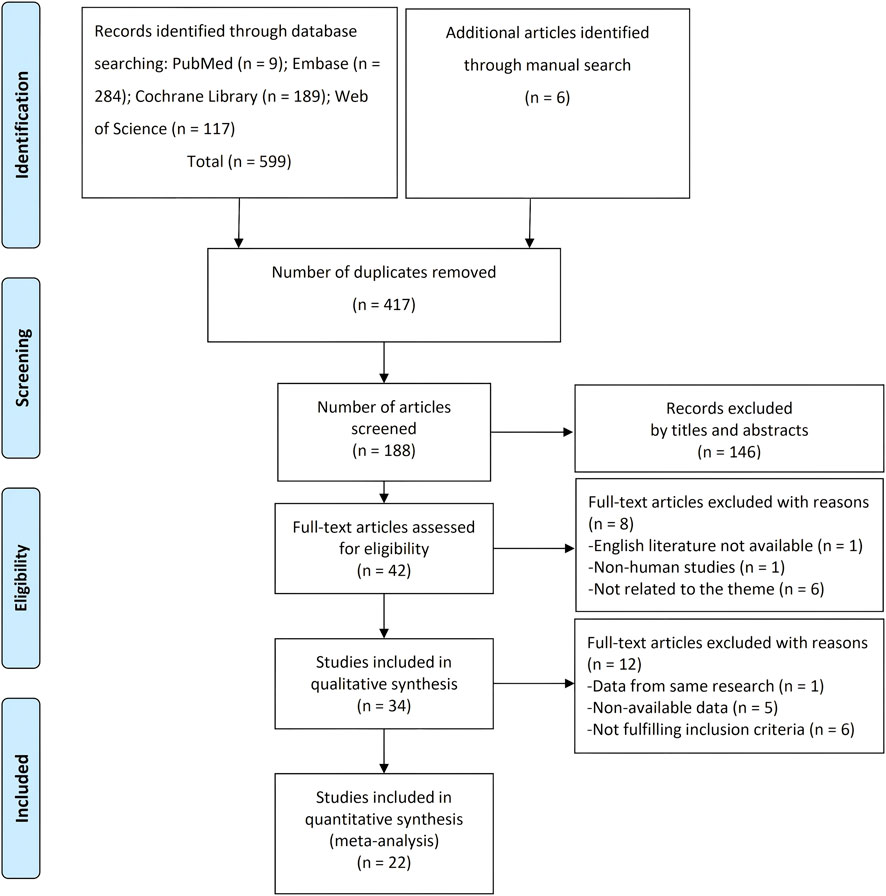Flowchart of article selection process for a study. Identification: 599 records identified through databases and 6 through manual search. Screening: 417 duplicates removed, 188 articles screened, 146 records excluded. Eligibility: 42 full-text articles assessed, 8 excluded for reasons like non-human studies. Included: 34 in qualitative synthesis, 12 excluded due to reasons like non-available data, and 22 included in meta-analysis.