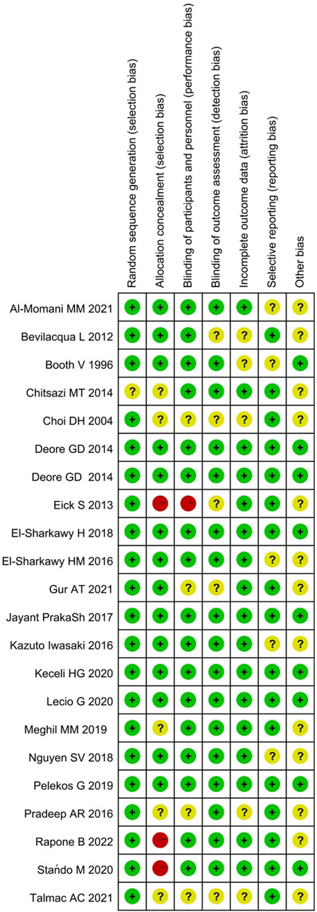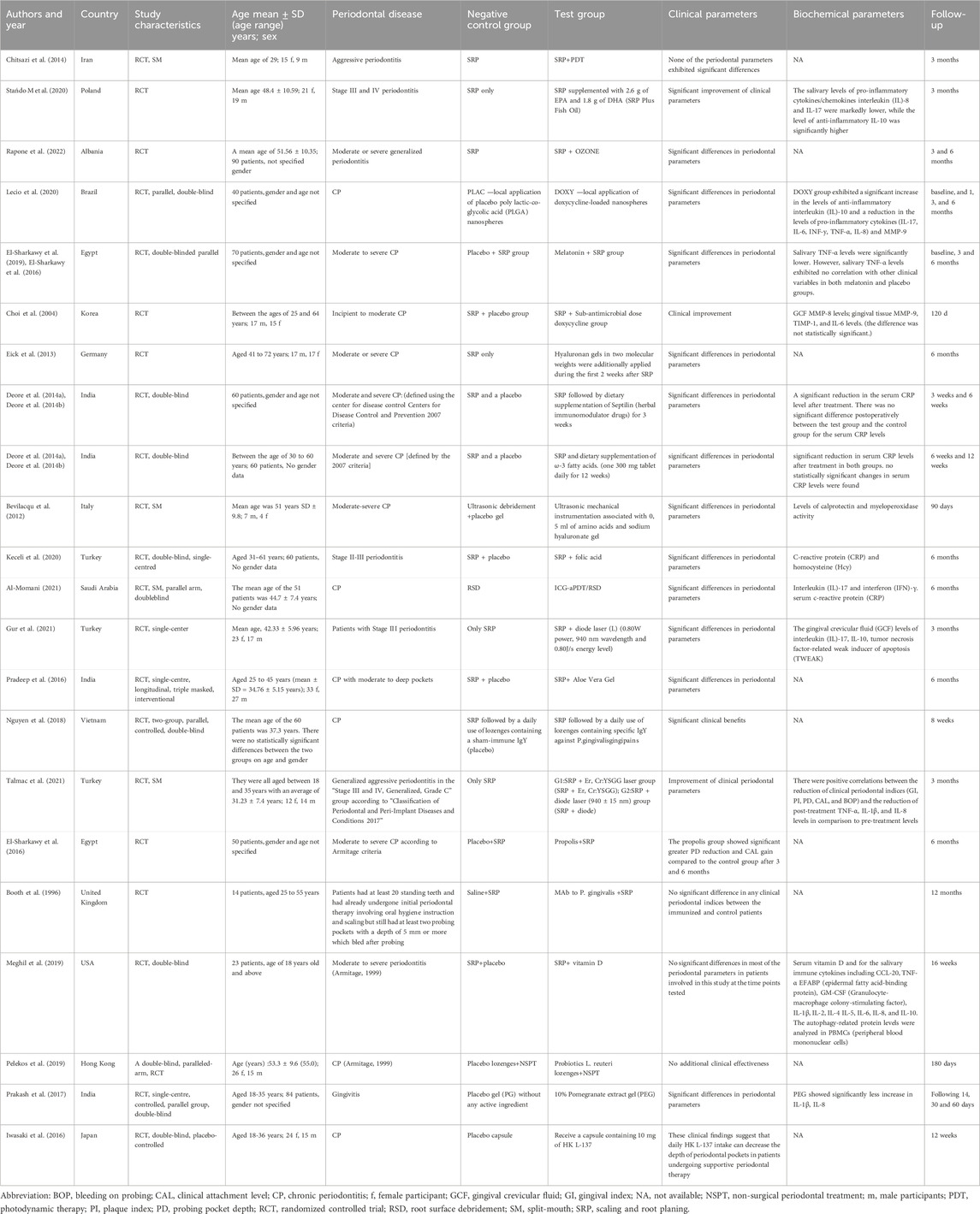 The characteristics of the included studies are summarized in Table 1. Among them, twelve studies were double-blind, placebo-controlled RCT (Deore et al., 2014a; Deore et al., 2014b; El-Sharkawy et al., 2019; Iwasaki et al., 2016; Pradeep et al., 2016; Prakash et al., 2017; Pelekos et al., 2019; Keceli et al., 2020; Lecio et al., 2020; Nguyen et al., 2018; Meghil et al., 2019; Al-Momani, 2021) and 10 studies were placebo-controlled RCT (Booth et al., 1996; Choi et al., 2004; Bevilacq et al., 2012; Eick et al., 2013; Chitsazi et al., 2014; El-Sharkawy et al., 2016; Talmac et al., 2022; Stańdo et al., 2020; Gur et al., 2022; Rapone et al., 2022). Publication years ranged from 1996 to 2022. The sample sizes ranged from 14 participants to 90 participants. The follow-up period was from 4 weeks to 12 months. Treatments include doxycycline (Choi et al., 2004; Lecio et al., 2020), PDT (Chitsazi et al., 2014; Al-Momani, 2021), omega-3 polyunsaturated fatty acids (Deore et al., 2014b; Stańdo et al., 2020), ozone (Rapone et al., 2022), melatonin (El-Sharkawy et al., 2019), propolis (El-Sharkawy et al., 2016), hyaluronic acid (Bevilacq et al., 2012; Eick et al., 2013), herbal medicine (Deore et al., 2014a; Pradeep et al., 2016; Prakash et al., 2017), folic acid (Keceli et al., 2020), vitamin D (Meghil et al., 2019), laser (Talmac et al., 2022; Gur et al., 2022), probiotics (Iwasaki et al., 2016; Pelekos et al., 2019), antibodies against P. gingivalis (Booth et al., 1996; Nguyen et al., 2018). Twenty studies were controlled against SRP alone or SRP with a placebo, and two studies only applied a placebo without SRP (Iwasaki et al., 2016; Prakash et al., 2017). All studies examined PD, and seventeen examined CAL (Choi et al., 2004; Bevilacq et al., 2012; Eick et al., 2013; Chitsazi et al., 2014; Deore et al., 2014a; Deore et al., 2014b; El-Sharkawy et al., 2019; El-Sharkawy et al., 2016; Pradeep et al., 2016; Talmac et al., 2022; Pelekos et al., 2019; Keceli et al., 2020; Lecio et al., 2020; Stańdo et al., 2020; Al-Momani, 2021; Gur et al., 2022; Rapone et al., 2022), eleven examined BOP (Choi et al., 2004; El-Sharkawy et al., 2019; Iwasaki et al., 2016; Prakash et al., 2017; Talmac et al., 2022; Pelekos et al., 2019; Lecio et al., 2020; Stańdo et al., 2020; Nguyen et al., 2018; Al-Momani, 2021; Rapone et al., 2022). Thirteen studies reported the immune outcomes (Choi et al., 2004; Deore et al., 2014a; Deore et al., 2014b; El-Sharkawy et al., 2019; Prakash et al., 2017; Talmac et al., 2022; Keceli et al., 2020; Lecio et al., 2020; Meghil et al., 2019; Al-Momani, 2021; Gur et al., 2022). No adverse events occurred in all the included studies. Most studies demonstrated that the clinical parameters were notably improved in both groups, while immunotherapy offers a more significant clinical benefit compared to placebo. Nevertheless, some studies suggested that adjunctive immunotherapies only brought similar benefits relative to placebo (Booth et al., 1996; Chitsazi et al., 2014; Pelekos et al., 2019; Meghil et al., 2019).