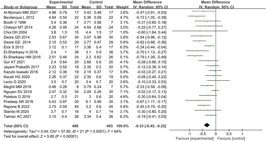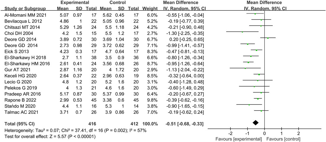 Seventeen studies included data on the effects of immunotherapies on CAL at 3 months (Choi et al., 2004; Bevilacq et al., 2012; Eick et al., 2013; Chitsazi et al., 2014; Deore et al., 2014a; Deore et al., 2014b; El-Sharkawy et al., 2019; El-Sharkawy et al., 2016; Pradeep et al., 2016; Talmac et al., 2022; Pelekos et al., 2019; Keceli et al., 2020; Lecio et al., 2020; Stańdo et al., 2020; Al-Momani, 2021; Gur et al., 2022; Rapone et al., 2022). Meta-analysis demonstrated that immunotherapies with SRP were associated with significantly improved CAL value when compared with placebo with considerable heterogeneity (p < 0.00001, χ2 = 37.41, I2 = 57%) (Figure 6; Supplementary Figure S2).