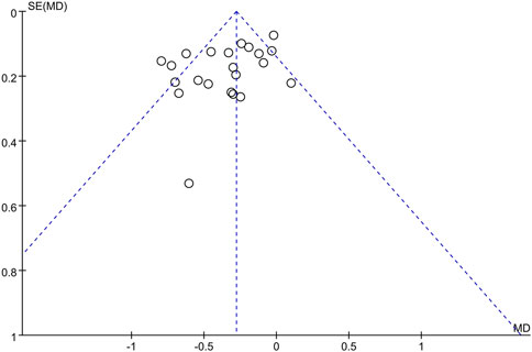 Funnel plot depicting the standard error (SE) of mean difference (MD) on the vertical axis against the MD on the horizontal axis. Data points are scattered around the vertical and diagonal dashed lines, forming an inverted funnel shape.