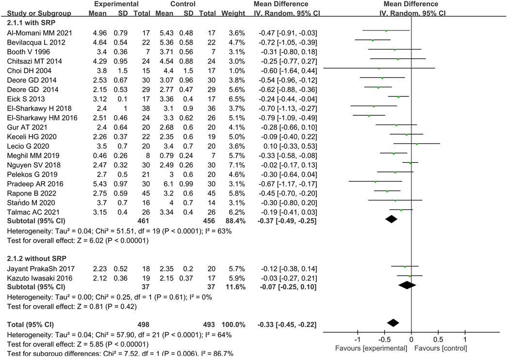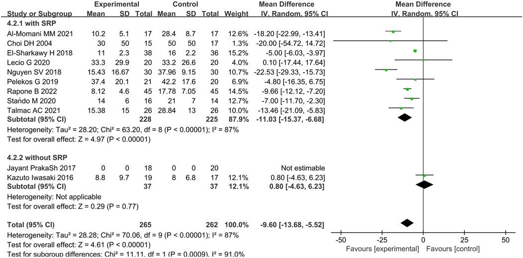 Forest plot showing meta-analysis results comparing experimental and control groups with subgroups: with SRP and without SRP. Includes study names, sample sizes, mean differences with confidence intervals, and weights. Heterogeneity and overall effect statistics are noted.